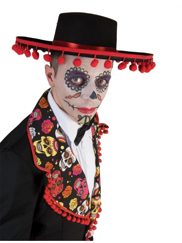 Pour compléter votre look, n’hésitez pas à ajouter des accessoires tels qu’un chapeau noir à bord large orné de motifs de squelettes multicolores, des gants noirs, des bottes hautes et des bijoux colorés pour ajouter une touche festive à votre tenue.