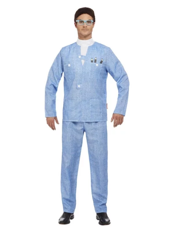 C’est une panoplie complète pour homme composée d’une veste et d’un pantalon bleu, de lunettes de savant et de la perruque assortie.