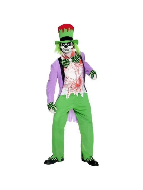 Le Déguisement clown méchant vert et violet homme comprend un haut violet (bordures noires), un pantalon vert (coupe droite), une chemise blanche (maculé de sang), un chapeau vert (texture feutre) et des gants verts (damier noir).