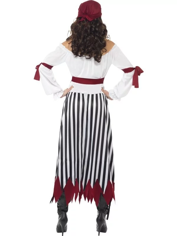 Le déguisement de pirate pour femme comprend la robe longue, la ceinture et le bandeau. Il est disponible en trois tailles : S, M et L. Les couleurs dominantes sont le blanc, le noir et le rouge.