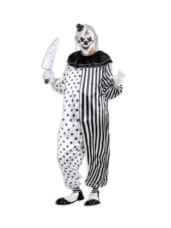 Le déguisement consiste en une combinaison d’un noir angoissant, agrémenté du col de clown et des boutons rouges macabres, signe apparent d’une vraie sanguinaire ! Heureusement qu’on parle du vêtement que vous porterez lors d’un simple événement costumé, où il n’est rien des scènes sanguinolentes des fameux films de clowns assassins sadiques. Quoique… avec le bon maquillage et le chapeau clownesque, et si vous partez avec un faux couteau, vous allez assurément plonger tout le monde dans l’effroi total.