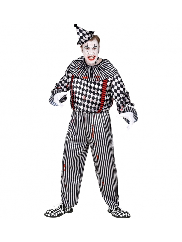 A la recherche d’un déguisement original pour Halloween ? Découvrez celui du clown vintage tueur. Il comprend la combinaison à losanges noirs et blanc avec un large collar type costume de Pierrot et une paire de bretelles rouge. Le chapeau pointu est assorti avec un pompon rouge.