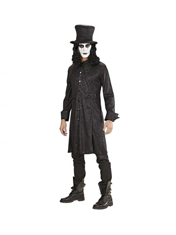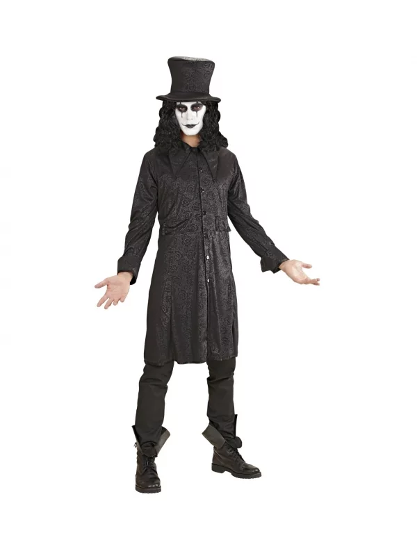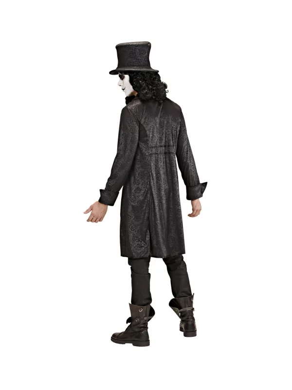 Ce déguisement se compose d’une veste noire avec des manches longues retroussées, le haut ajusté à la taille et le bas légèrement évasé. Un chapeau haut de forme noir est fourni avec la veste. L’étoffe présente des motifs floraux de roses également en noir qui apportent une touche d’élégance à la tenue. Une perruque cheveux longs et des paires de bottes noires vont permettre d’imposer votre style homme des ténèbres.