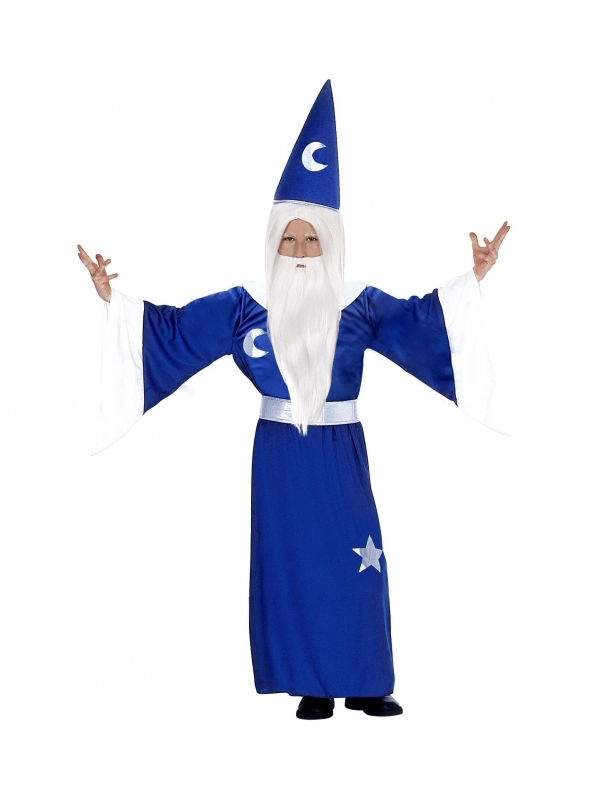 Le déguisement de magicien est bleu avec des étoiles et une ceinture couleur argent. Il comprend également un chapeau pointu assorti.