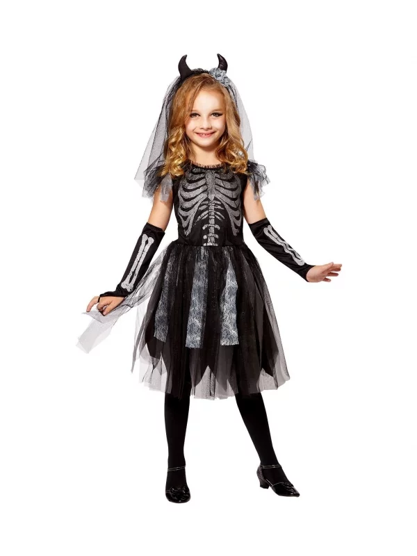 Déguisement Mariée fille squelette noir (robe, mitaines, voile de mariée avec cornes)