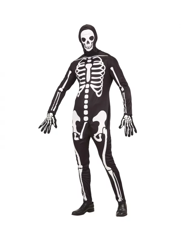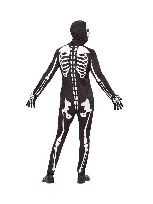 Il s’agit d’une combinaison toute noire avec une image de squelette de la tête au pied, en passant par le bijou de famille.